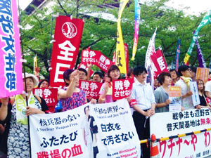 参加者は6月15日から「戦争法案許すな!」と座り込みが続く国会に向けて国会請願デモを行い、座り込む人々と互いに手をふったり、拍手を送るなど熱いエールを交換しました。