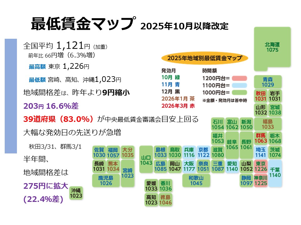 2025年最低賃金改定は、すべての都道府県で2025年度の最低賃金の引き上げ額が出そろい、47都道府県で、63円~82円の引き上げで、加重平均は1,121円(前年比+66円、+6.3%)となりました。中央最低賃金審議会答申が地域間格差を縮める目安を出し、その目安を39道府県(83%)が上回りました。引き上げの根拠として地域間格差による「労働力人口流出」や「地域間格差是正」を挙げていることが特徴となっており、地域間格差の解消めざす流れが強まりました。