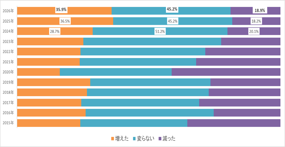 前年の年収との比較では、「増えた」と答えた人は35.9%で、「変わらない」と答えた人は45.2%でした。春闘での賃上げや地域別最低賃金の引上げなどで年収が増えている割合が2020年以降増加傾向にありますが、生活実感は改善していません。また、18.9%の人が「減った」と回答しています。