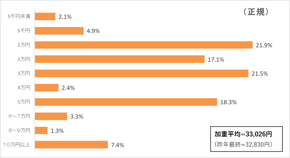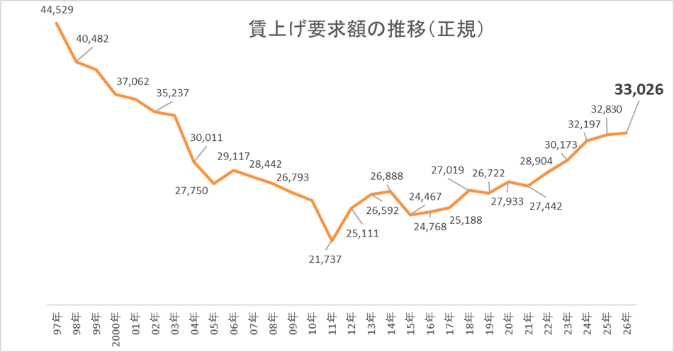 賃上げ要求の加重平均額は33,026円で、前年最終集計の32,830円を196円上回っています。