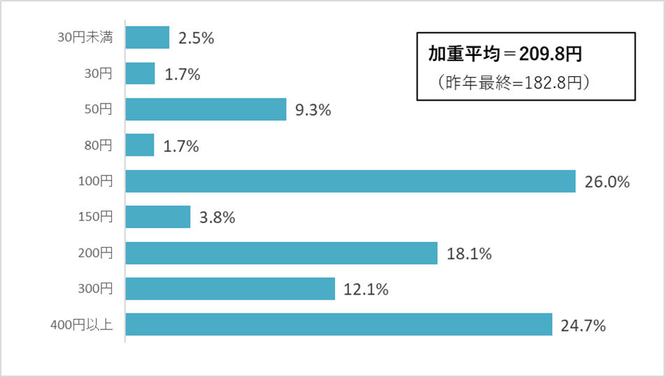 時間額での賃上げ要求の加重平均は209.8円で、前年最終集計182.8円を27円上回っています。