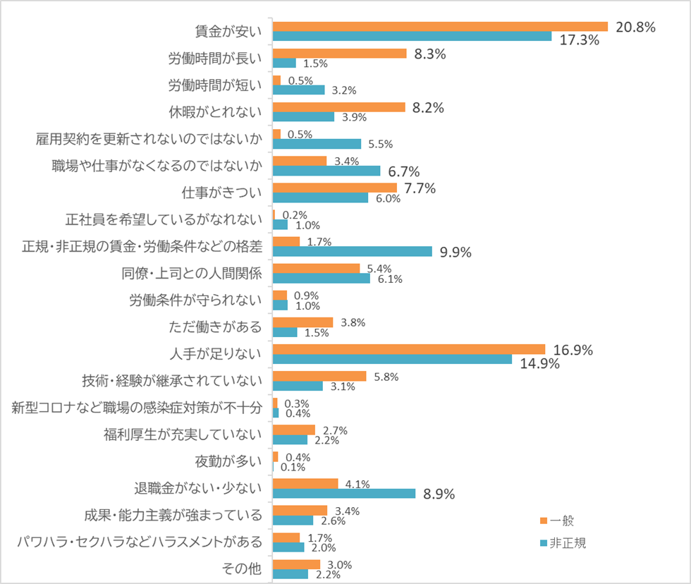非正規アンケートをみると、「賃金が安い」が17.3%と最も多く、「人手が足りない」14.9%、「正規・非正規の賃金・労働条件などの格差」9.9%、「退職金がない・少ない」8.9%、「職場や仕事がなくなるのではないか」6.7%と続いています。