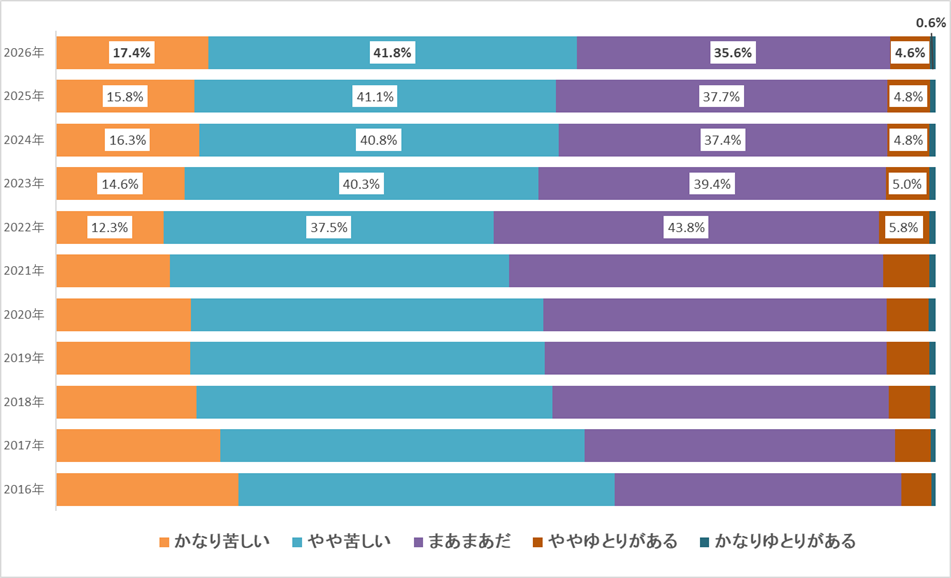 労働者の生活実感は、「かなり苦しい」が昨年から1.6㌽増加し17.4%となっています。「やや苦しい」は41.8%で、合わせた<苦しい>層が59.2%と、昨年の56.9%から2.3㌽増えています。<まあまあ>と感じている層の割合は35.6%で、「ややゆとりがある」4.6%、「かなりゆとりがある」は0.6%にとどまっています。