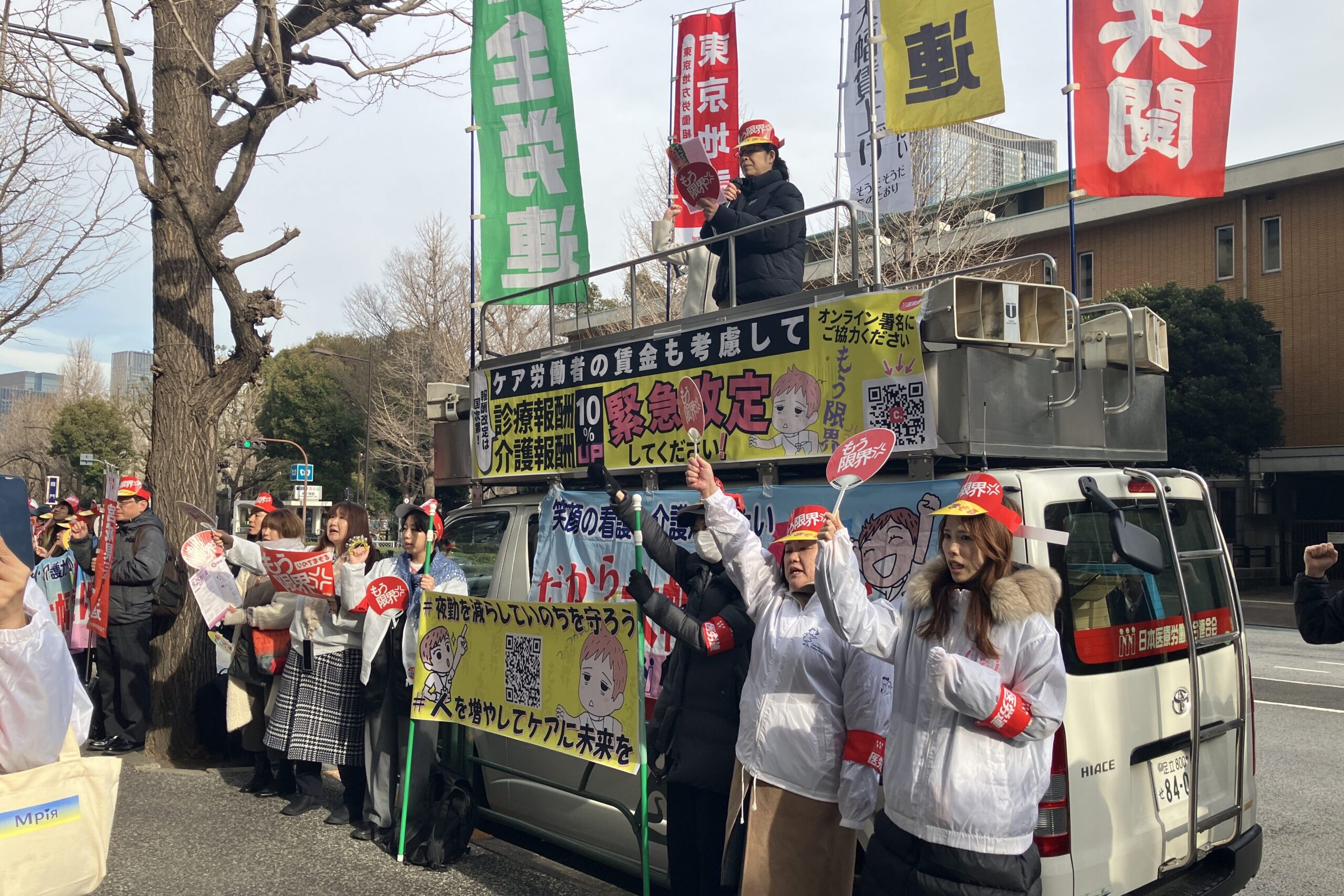 日本医労連は1月15日、すべてのケア労働者の大幅賃上げと医療・介護・福祉の維持のために報酬10%以上の引き上げを求め、春闘決起行動を展開した。