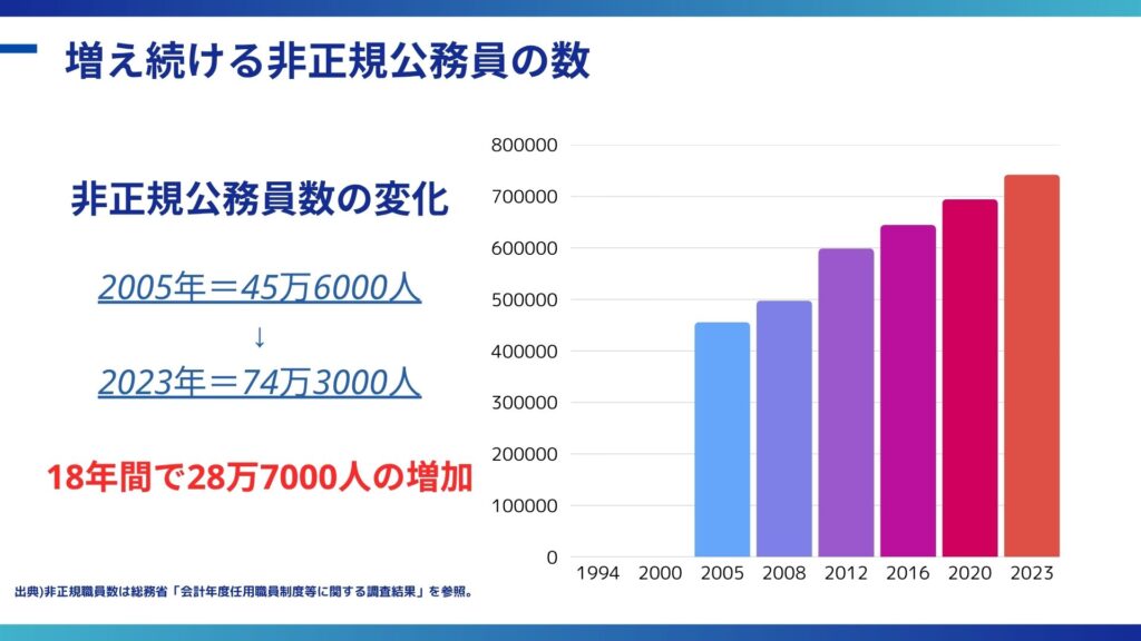 非正規公務員の数は年々増え続けており、下記のグラフにあるように2023年の時点で74万人強となり、