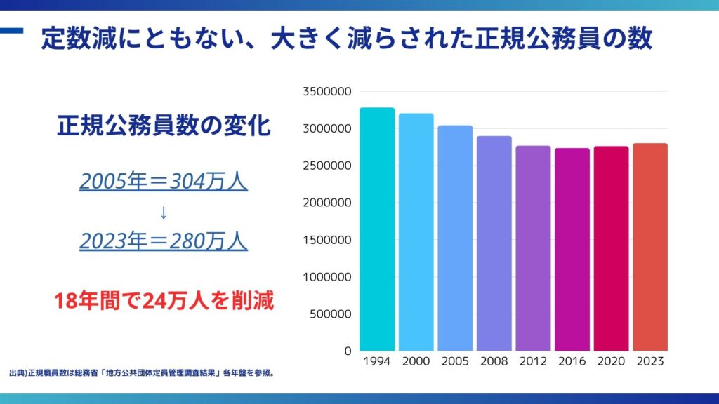 この20年ほどで約29万人も増えているのです。そしてその一方で、正規職公務員の数は24万人も減らされています。