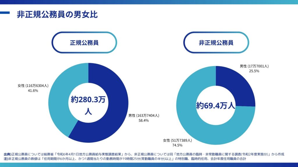 これは、前述の職種別の割合にも名前があがっていたような教育や保育など「ケア労働」と呼ばれる女性比率の高い分野において、急激に非正規公務員化させられたことによるものです。