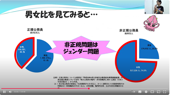 つまり公務員なのにワーキングプアという、官製ワーキングプアという状況に陥っている方が少なくないのです。これは、教育や保育など「ケア労働」と呼ばれる女性比率の高い分野において、急激に非正規公務員化がすすめられたことによるものです。