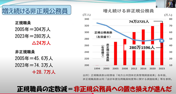 非正規公務員の数は年々増え続けており、下記のグラフにもあるように2023年の時点で74万人強、この20年ほどで約29万人も増えています(その一方で正規職公務員の数は24万人も減らされています)。
