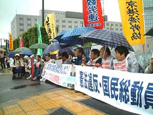 前夜からあいにくの雨模様になった東京では、東京春闘共闘が都内157カ所での早朝宣伝、夜には28カ所の地域集会・デモ行進を取りくんでいます(いずれも計画段階)。昼間は中央単産や民主団体と共同しながら、国会・霞ヶ関周辺で大行動を展開。「小泉やめろ!」を掲げた国会前座り込み行動に600人、財務・金融共同行動に800人、厚生労働省個人請願に400人、日比谷野外音楽堂からの国会請願デモに1000人、街角大宣伝行動(医労連など)とつなぎ、大規模な終日行動となりました。