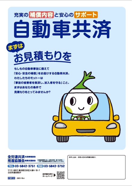 自動車共済(2025年10月新パンフ作成しました) ダウンロードして使ってください。(A3両面印刷、二つ折り) 全労連共済の自動車共済は、全労連共済が全国5つのエリア【北海道】【東北】【関東】【中部】【西日本】の自動車共済協同組合と代理所契約を締結しており、団体扱いで契約をします。