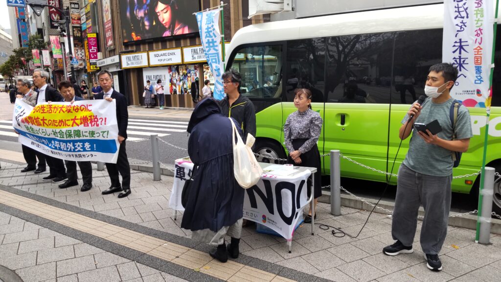 憲法共同センターは10月9日昼、新宿駅東南口で「9の日」宣伝を行い、8団体17人が参加しました。大軍拡反対請願署名には6人の方が協力してくれました。