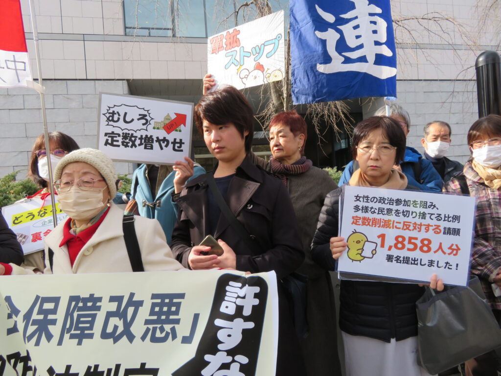 衆議院第2議員会館前で、民意を切り捨てる定数削減法案は廃案に!と声をあげる参加者たち