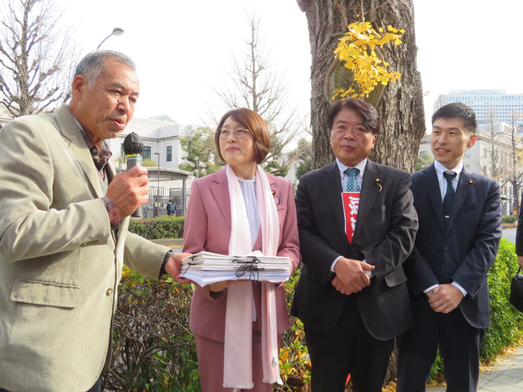 主催者を代表して挨拶した農民連の藤原麻子事務局長は、議員定数削減法案について「臨時国会終盤になって提出理由や根拠も示さず乱暴な中身だ。議会制民主主義の破壊は許さない。地方で暮らす人々の声が今よりもっと届きにくくなり、民意を反映した国会運営ができなくなる」と批判。また、2日に出された財政審建議について、「今回のコメ不足と米価高騰を招いた政府の責任を免罪するものだ」と指摘。主要食糧法第2条で定められている米の受給と価格の安定を図るための責任を政府が果たしてこなかったことを強く抗議し、「市場任せのコメ政策は改めるべきだ。軍事費を削って、くらしと福祉・教育、農業にまわせ!の声を大きく広げよう」とよびかけました。
