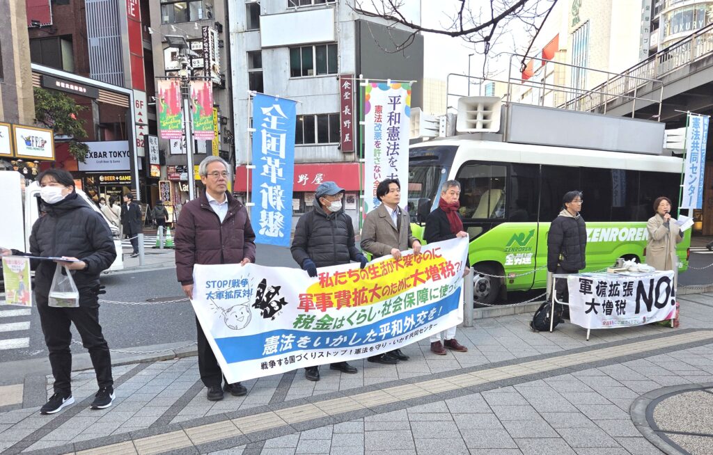 憲法共同センターは1月9日昼、新宿駅東南口で「9の日」宣伝を行いました。宣伝では、総がかり行動実行委員会が取り組む「大軍拡反対請願署名」に取り組み、6人の方が協力してくれました。
