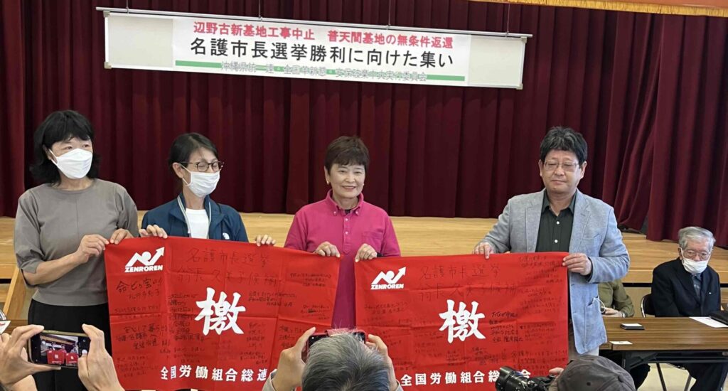 沖縄県労連は、辺野古新基地を抱える名護市長選挙の勝利は、基地あるが故の事件・事故から県民を守り、誇りある豊かな名護市の実現につながるとし、10月の幹事会で翁長さん支援を決定。全労連も支援決定した。
