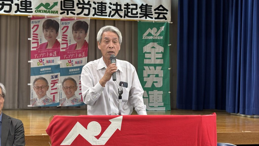 沖縄県労連の穴井輝明議長は開会挨拶で、人類の生物学的寿命は38歳であるが医学の発達により70歳まで生きられるようになったこと、しかし戦争が寿命を縮める大きな要因であると話しました。それをストップさせるために、翁長クミコさんが市長になる必要があると訴えました。