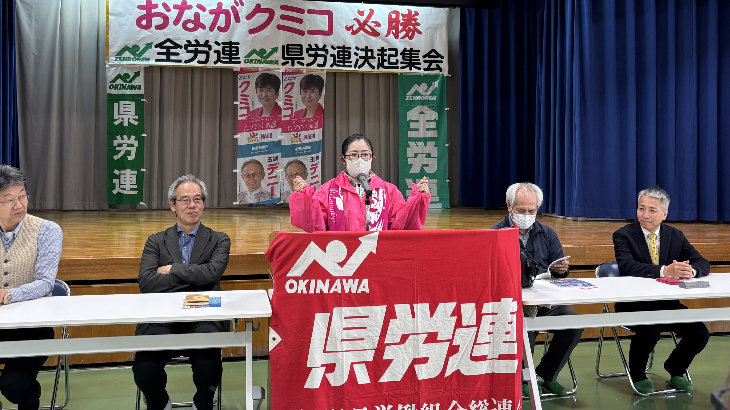 全労連と沖縄県労連は1月17日、名護市長選挙(1月18日告示、25日投開票)での翁長クミコ候補必勝決起集会を行いました。1月というのに20℃を超える暑さのなか、県内外から70人が参加しました。自治労連、東京労連、愛労連などの代表が挨拶しました。