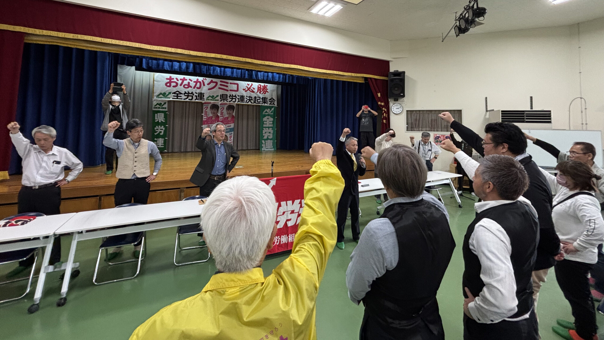 福岡県労連の相場裕二書記次長は、九州全体の軍事基地化が急速に進んでいると語り、これを許してはいけないと訴えました。さらに、統一教会が応援している現職市長にさらに4年間任せるのか、平和を本当に大事にする翁長クミコ市長の誕生でで4年間私達の暮らし第一の市政かが問われている分かれ目だと語りました。