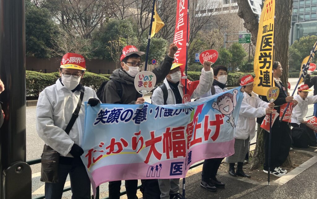 日本医労連は、診療報酬・介護報酬の10%引き上げを今春闘で要求しています。