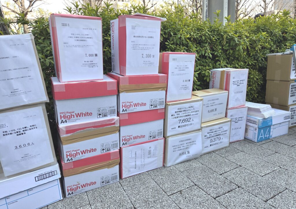 総がかり行動実行委員会は2月18日(水)の昼、「翼賛国会許さない!スパイ防止法と高市政権NO!2・18特別国会開会日行動」を行い、250人が参加しました。大軍拡反対請願署名のほか、244,689人分の署名を提出ました。大軍拡反対請願署名は累計で315万6,613人分となり、大きな広がりとなっています。
