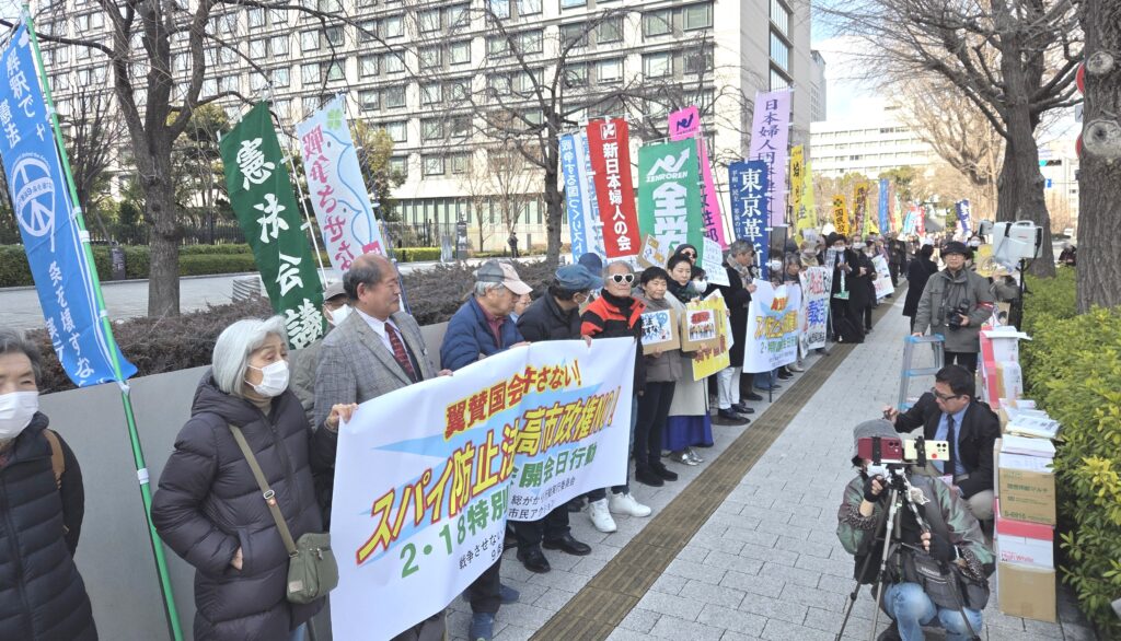 参加者からの訴えでは、「共謀罪NO!実行委員会」の角田富夫さんは、国家情報局の設置やスパイ防止法により、市民を監視する社会が作り上げられる危険性を指摘し、「日本の全ての情報機関を統括させ、市民総監視の時代を作り上げようとしている。『市民を監視する機関がスパイ防止法を作る』こんなことは絶対に認められない」と強調しました。