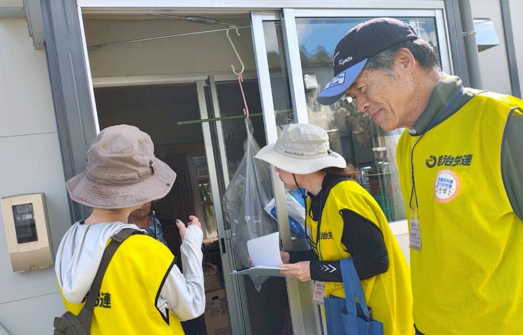 全労連能登半島地震水害対策本部は9月27、28日に第12次ボランティアを行い、全国から46人が参加。珠洲市と輪島市で草取りや仮設住宅訪問活動を行った。