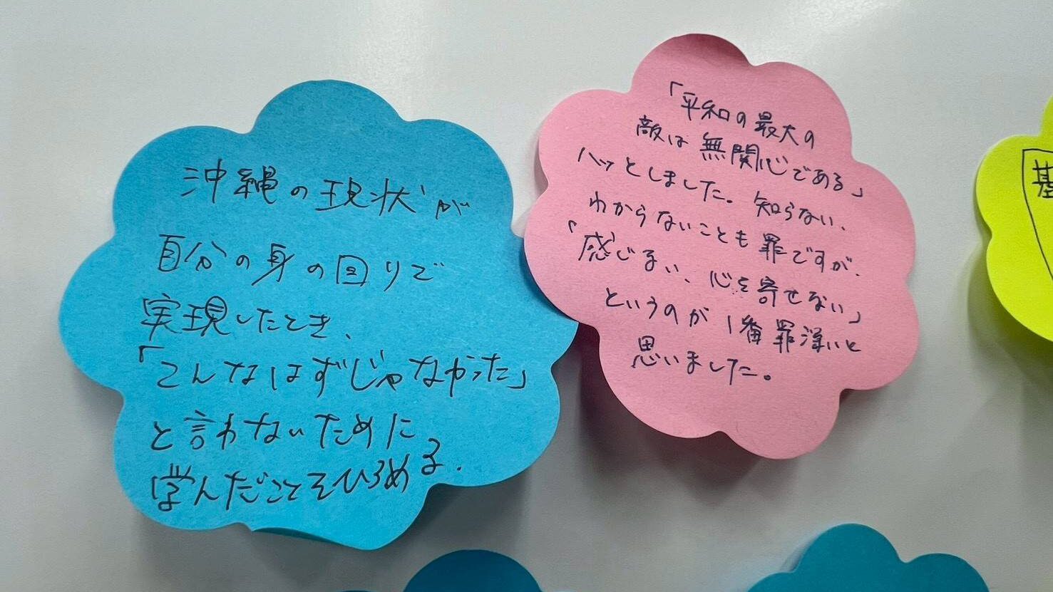 平和大会の分科会では、スピーカーが「もし自分の身に起きたら」という視点で、沖縄戦や基地問題を語った後、70人以上の参加者がふせんに感想を書き込んで、全体に共有して進行した。「知らないことも罪だが、心を寄せないことが一番罪深い」などの感想から、自分ごととして考えてくれているとわかった。