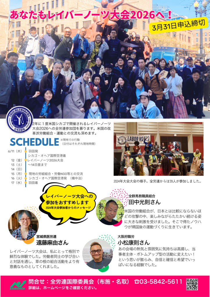 レイバーノーツ2026大会(2026年6月12~14日)に、全労連として下記の概要で参加団を募ります