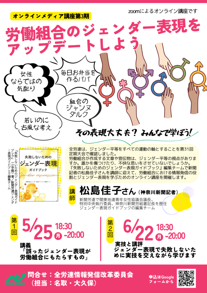 労働組合が作成する文章や宣伝物は、ジェンダー平等の視点がありますか。誰かを傷つけたり、不快な思いをさせていないでしょうか。『失敗しないためのジェンダー表現ガイドブック』編集チームで新聞記者の松島佳子さんを講師に迎えて、労働組合における情報発信の役割とジェンダー表現を学ぶための連続オンライン講座を開催します。