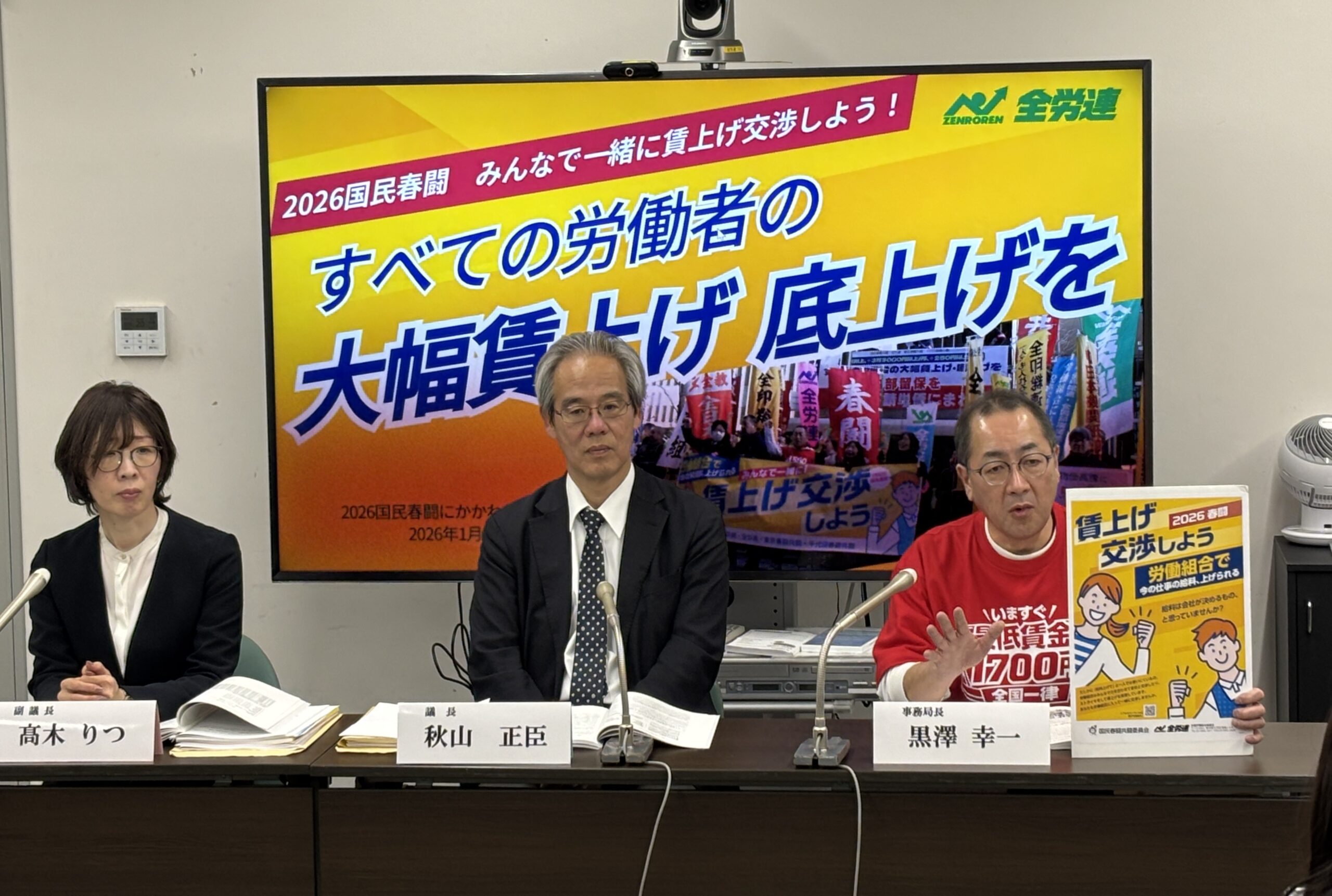 カテゴリー別に探す ニュース 声明・プレスリリース イベント 国際連帯 2026/01/21 キャンペーン 労働法制中央連絡会NEWS 2026.1.21号 労働法制中央連絡会NEWS 2026.1.21号 2026/01/21 声明・プレスリリース 【談話】経団連「2026年版経営労働政策特別委員会報告」の発表にあたって 【談話】経団連「2026年版経営労働政策特別委員会報告」の発… 2026/01/21 ニュース 憲法共同センターニュース第541号 憲法共同センターニュース第541号 2026/01/21 月刊全労連 2026年2月号(通巻348号) 2026年2月号(通巻348号) 2026/01/20 ニュース Ep.13 26国民春闘闘争宣言!「労働組合で、みんなで一緒に賃上げ交渉しよう」 Ep.13 26国民春闘闘争宣言!「労働組合で、みんなで一緒… 2026/01/20 キャンペーン 26国民春闘「はたらくみんなの要求アンケート」第2次報告 26国民春闘「はたらくみんなの要求アンケート」第2次報告 2026/01/20 全労連新聞 【レバカレその後】仲間と踏み出す変化への一歩 02 【レバカレその後】仲間と踏み出す変化への一歩 02 2026/01/20 声明・プレスリリース 【談話】解雇金銭解決制度の検討会の立ち上げに対する事務局長談話 【談話】解雇金銭解決制度の検討会の立ち上げに対する事務局長談… 2026/01/19 ニュース 名護市長選 全労連・沖縄県労連決起集会 名護市長選 全労連・沖縄県労連決起集会 2026/01/19 対話と学びあい 対話と学びあいスクール in 地域一般労働組合・青年ユニオン東北ブロック交流集会 対話と学びあいスクール in 地域一般労働組合・青年ユニオン… 12345...102030...>≫
